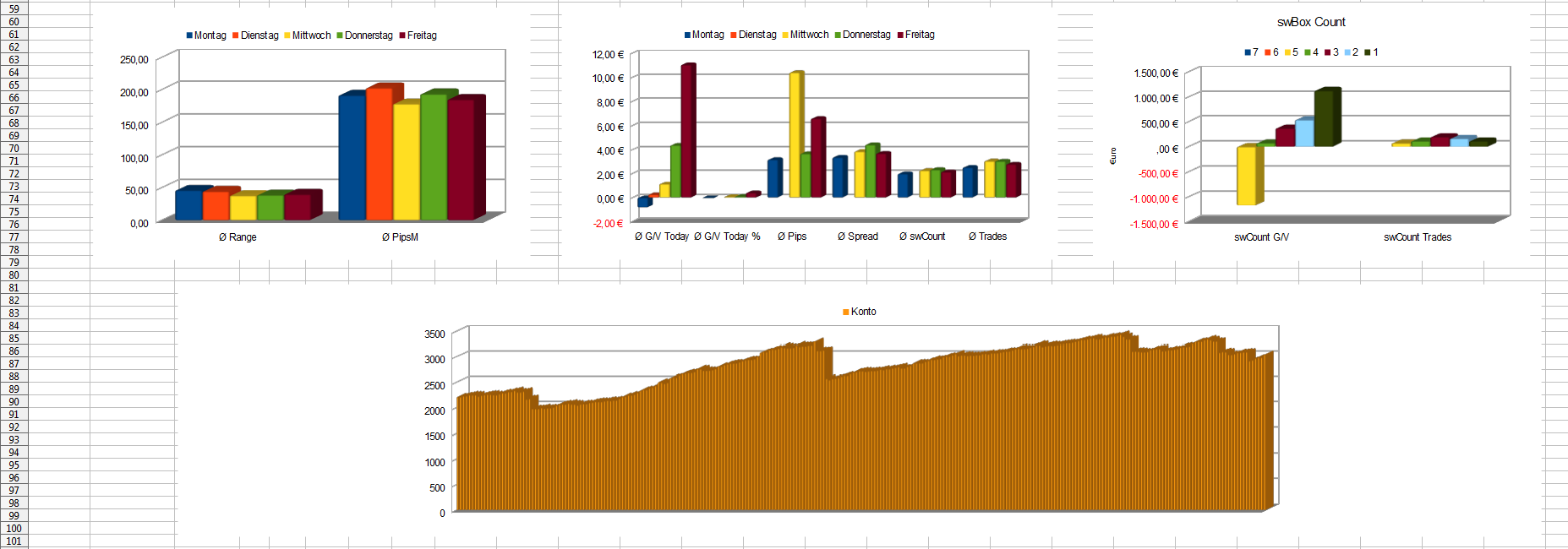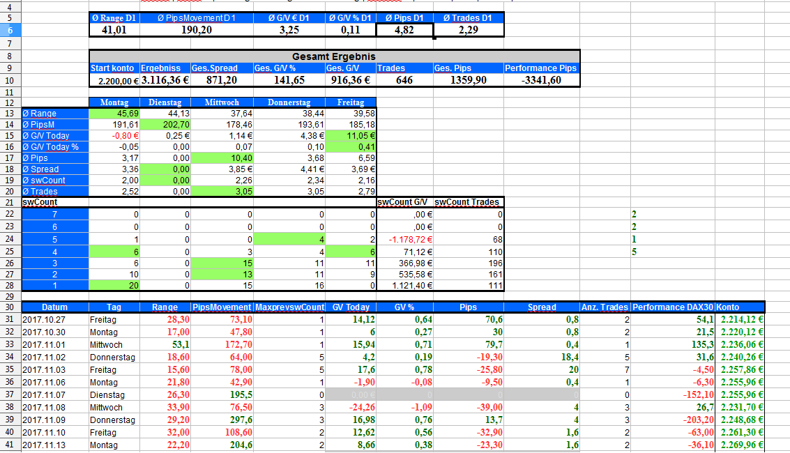 1 Statistik-Mode zur Auswertung der Trades inkl. Calc-sheet (Auswertung vom Life Konto mit sw-Box Strategie 27.10.2017 - 7.12.2018. Beim Backtest keine Spread-Auswertung möglich)