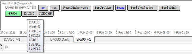 Der Watchlist Indikator für den Meta Trader 4 ist ein Indikator der in allen Assets (Forex, Aktien, Indizes...) eingesetzt werden kann. Mit diesem Indikator brauchen sie keine Exel oder Text-Dateien mehr anlegen oder Screenshots von ihren Analysen machen um sie dann zu suchen und zu öffen. Der Watchlist Indikator speichert ihre vollständige Analysen und alamiert per Sound, Pop up, E-Mail oder Push Nachricht auf ihrem Smartphone, wenn ein eingegebenes Kursziel erreicht wurde. Auch wenn der Chart gar nicht geöffnet ist !! Sie Brauchen nur noch einen Chart in dem sie ihre Assets analysieren, wichtige Kursziele angeben und zur Watchlist hinzufügen. Dann können sie sich entspannt zurücklehnen und auf einen Alarm warten. Mit einem Tastendruck können sie in der Market Watch Asset für Asset durchgehen und analysieren. Alle in der Watchlist gespeicherten Assets werden im Indikatorfenster angezeigt. Mit einem Klick auf einem Asset wird ihre Analyse in dem Chart oder in einem neuem Fenster geladen.